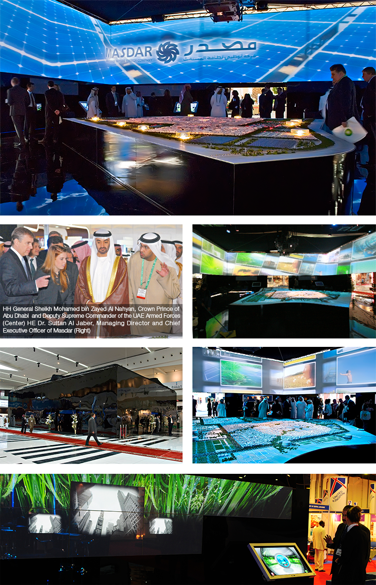 Inspired by the microchip-like layout of Masdar City, mamemo productions created a cutting edge, sleek black cube design for Masdar which stood out above other displays at the 1st World Future Energy Summit.